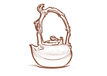 豐腴鮮熟的大桃為壺身,利落地向前延伸出流,流型挺秀可喜。壺腹一溜飽滿弧線,更加生動了桃實鮮嫩水淋的模樣。桃干提梁塑得拙樸老練,夸張凸起的老干結頭不僅豐富視覺感,也產生寓于形外的延伸想象。