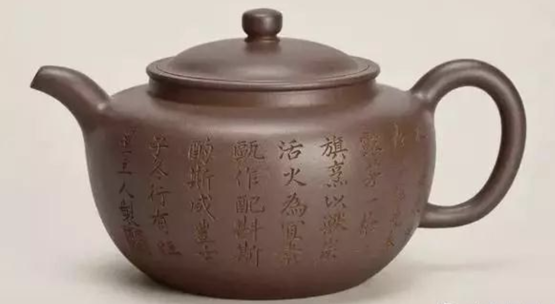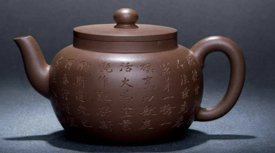 此壺壺身所刻四言詩「挹彼甘泉,清泠注茲。先春露芽,一槍一旗。烹以獸炭,活火為宜。素甌作配,斟斯酌斯」。降款「講光巳酉春,行有恒堂主人制」,鐫「定邸清賞」鈐記款。