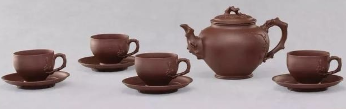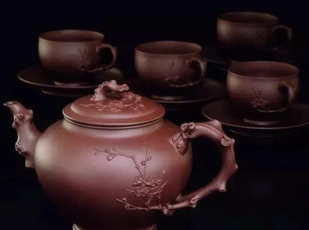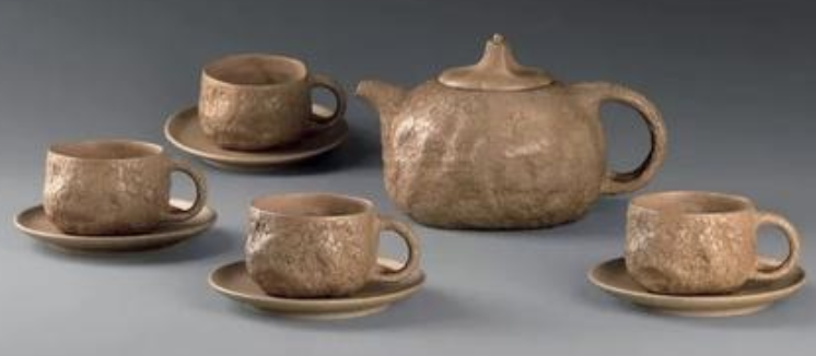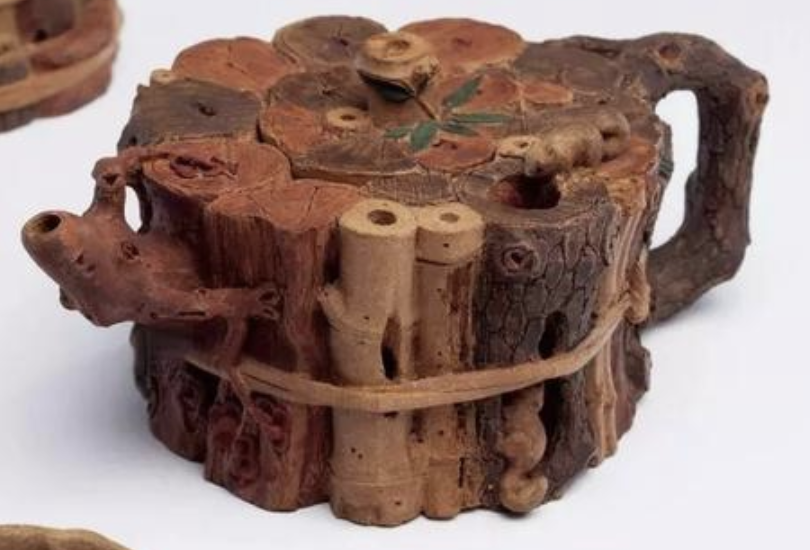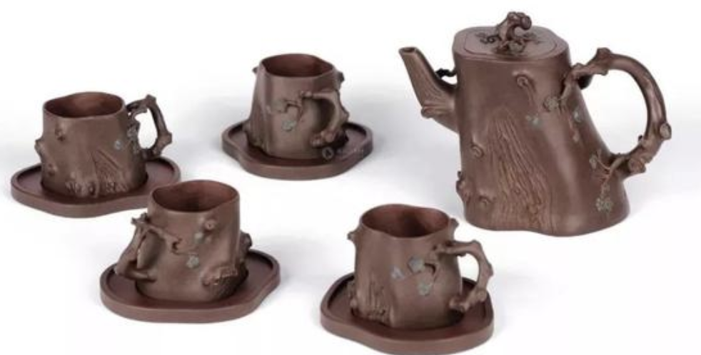 這一套茶具創(chuàng)造的閉頭是供春壺的身筒和杯子的身筒,由于供春壺壺身是“樹癭”,也即是大樹虬枝上的樹瘤,有凹有凸。樹癭紋路要亂而沒有散,完全效驗又央求骨血勻和、精力豐滿,藝術(shù)作風(fēng)協(xié)調(diào)一致。